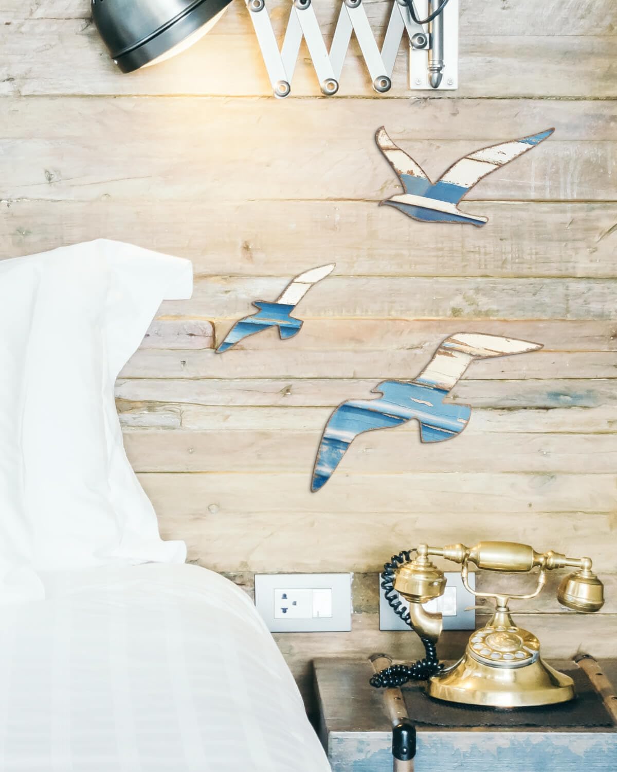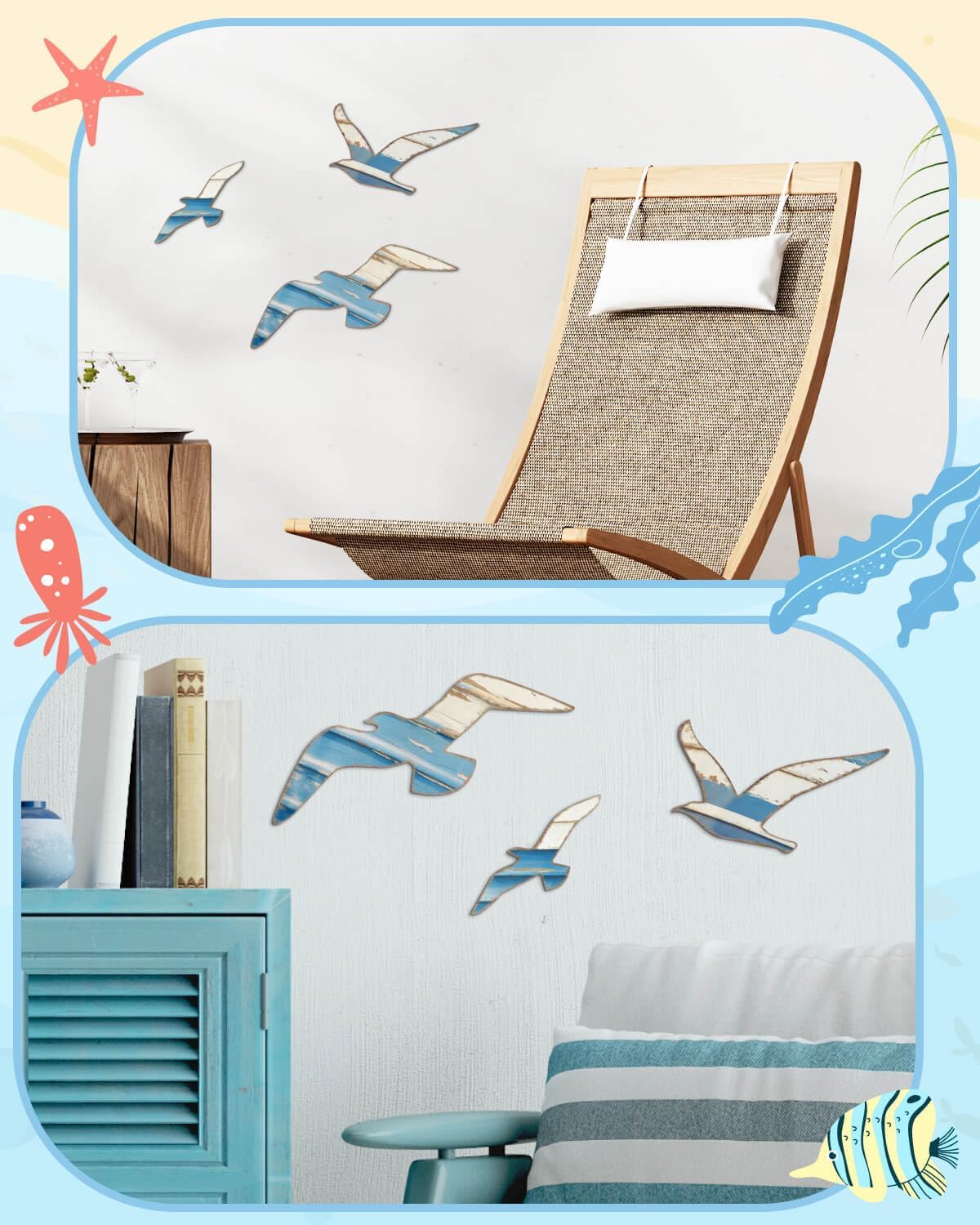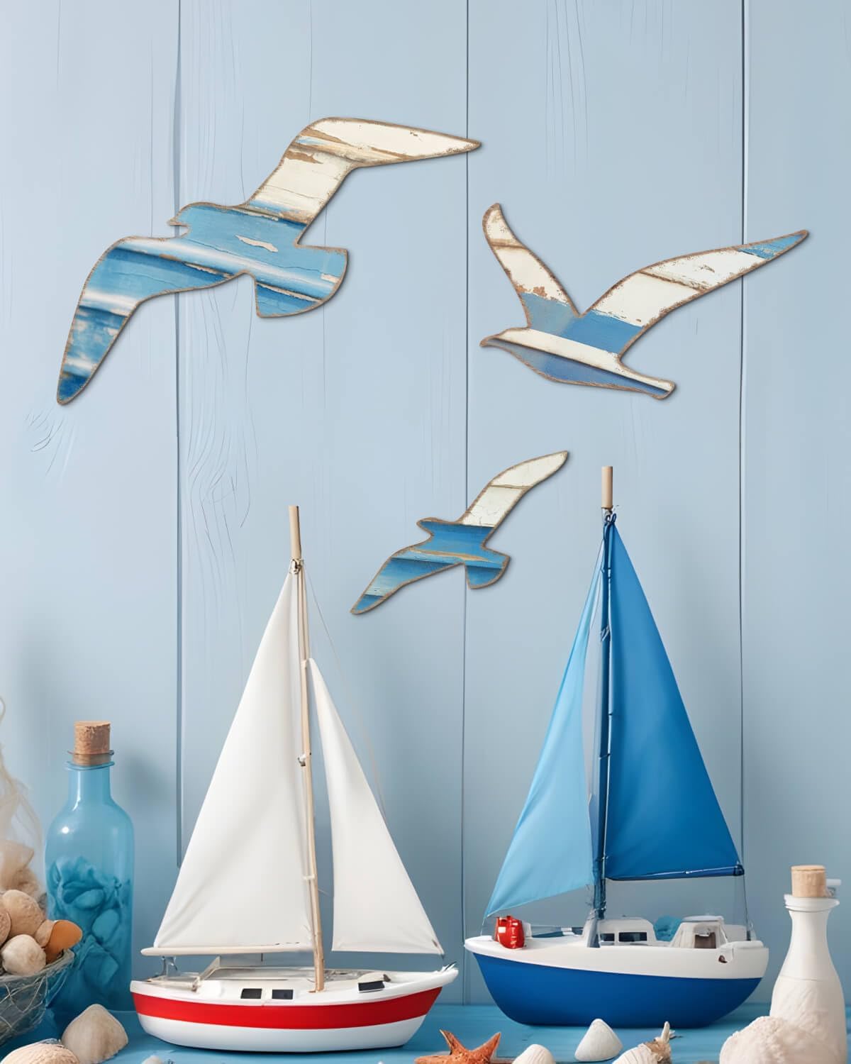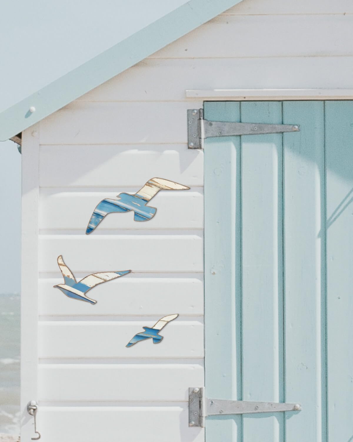 Mediterranean Style Wooden Seagull Wall Decor – 3-Piece Blue and White Rustic Wall Art Set with Adhesive Stickers for Coastal Living Room, Bedroom, Balcony